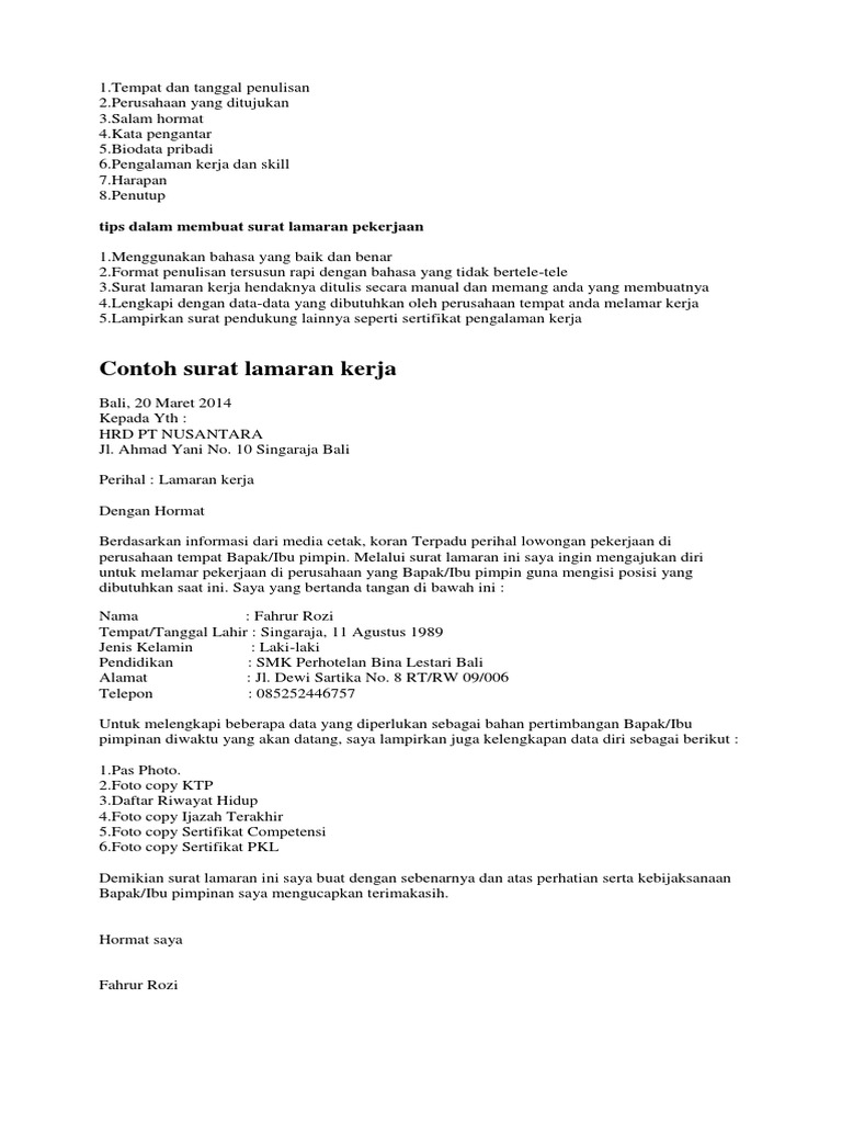 Jika anda membutukan contoh surat lamaran kerja umum, anda bisa coba baca beberapa referensi yang telah kami buat dari text dan dengan gambar. Ada baiknya untuk menuliskan infomasi tentang pengalaman dan keahlian yang anda miliki agar anda memiliki nilai plus dimata hrd. Dalam contoh surat lamaran kerja garment, gawe cv telah memilihkan tema atau template yang terbaik untuk dijadikan inspirasi, ide ataupun acuan dalam penulisan surat anda. Contoh lamaran pt cpb / inilah pola surat lamaran kerja di bank dalam bahasa inggris banyak sekali posisi fezarzone. Contoh surat lamaran kerja marketing ~ saat kamu ingin melamar pekerjaan di divisi marketing di berbagai perusahaan swasta maupun instansi bumn seperti pt.telkomsel, tokopedia, gojek, grab, bukalapak, pertamina, indosat, shell, pln, atau lainnya, pasti hal pertama yang harus kamu lakukan sebagai pelamar adalah membuat surat lamaran kerja marketing yang baik dan benar.